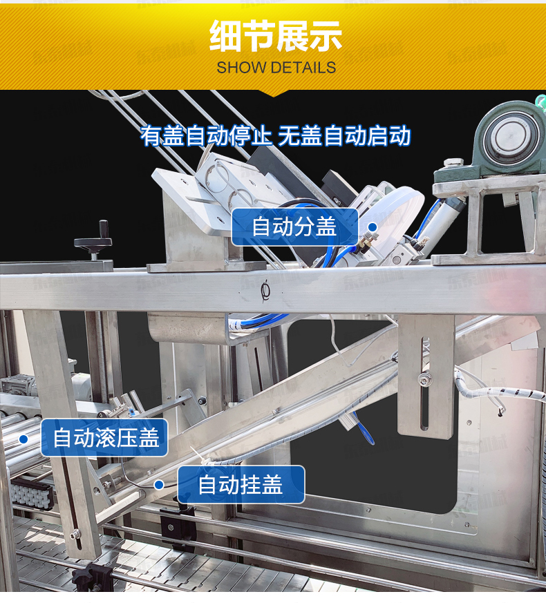 操作:人工放蓋到料倉(cāng),機(jī)器自動(dòng)定位、自動(dòng)落蓋、自動(dòng)掛蓋、自動(dòng)滾蓋