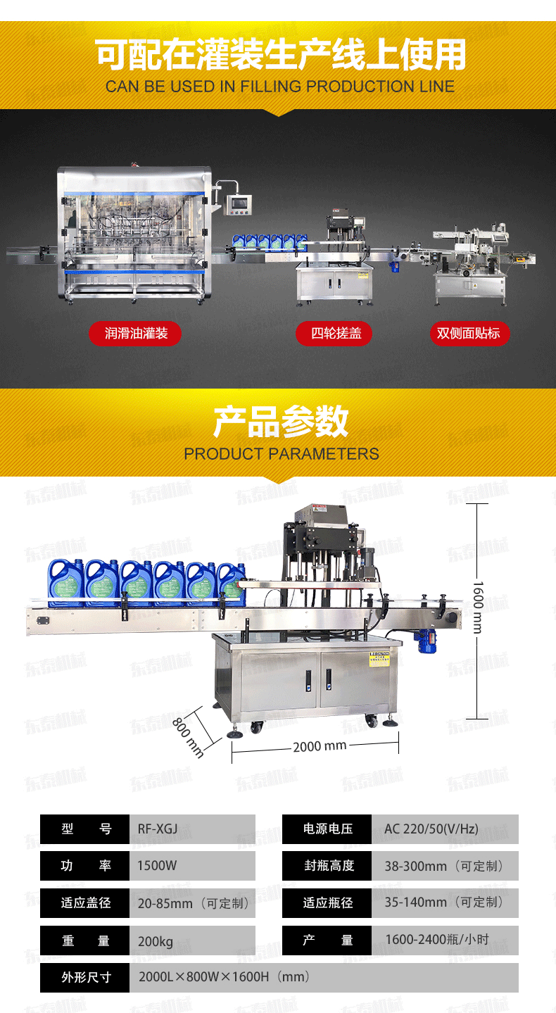 全自動旋蓋機是參照國機型改進設計、旋蓋速度快,合格率高、操作方便。可適用于食品、制藥、日化、農藥、化妝品等行業的不同瓶形的旋蓋。四臺調速電機分別用于供蓋、夾瓶、傳送、旋蓋,機器自動化程度高,穩定性好,調節方便,更換瓶形或蓋時無須備件,只需作調整即可完成(如配上蓋機,可進行自動上蓋)可以根據實際需要選配。