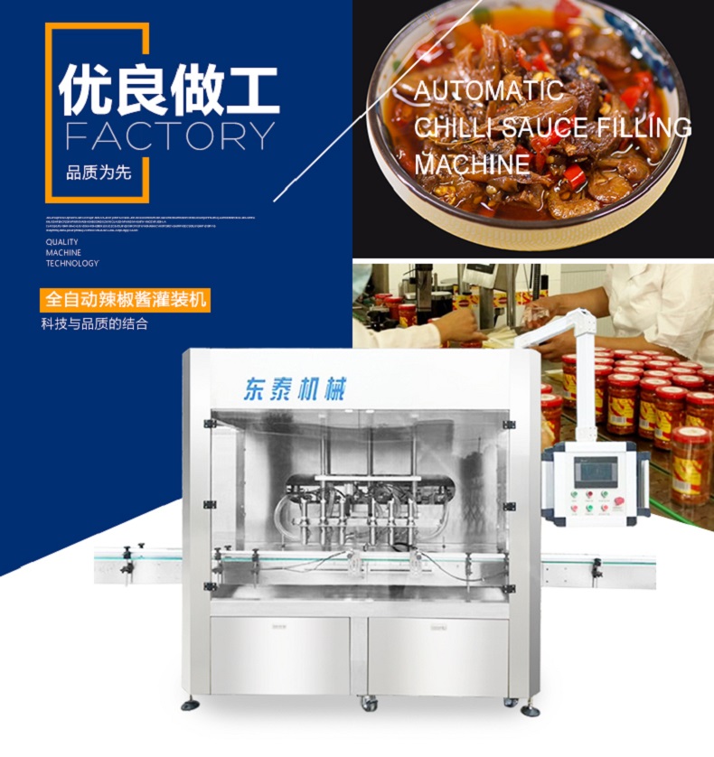 產品簡介 全自動辣椒醬類醬體灌裝生產線作為公司新研發的灌裝設備在市場上起到了關鍵性的作用,獨特的技術讓整個包裝市場變得富有生命力,是集光,機,電,氣于一體,采用活塞式定量原理,灌裝精度高,操作簡單,