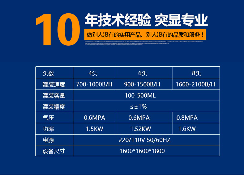 設備特點: 1、快速清洗、便于調整、容積缸體動作無極調速,適合不同規格、不同物料的灌裝。充填量一次調整完畢,每個容積缸體可分別微量調節,灌裝精度高且一致性好。接觸物料的材料為316不銹鋼、硅橡膠、符合QS規范。 2、進口減速電機無極調速控制灌裝柱塞缸,不僅適合各種膏體,亦適合醬料。 3、進口電磁離合器和電磁制動器配合動作,消除慣性,灌裝精度高。 4、人機界面與PLC通訊,調試設備或更換品種只需在屏幕上設定。進瓶、定位、灌裝充填、出瓶均自動作業。 5、灌裝時瓶子不到位、瓶子堵塞活出液管沒有插進瓶子時設備將自動保護,排除后繼續作業。