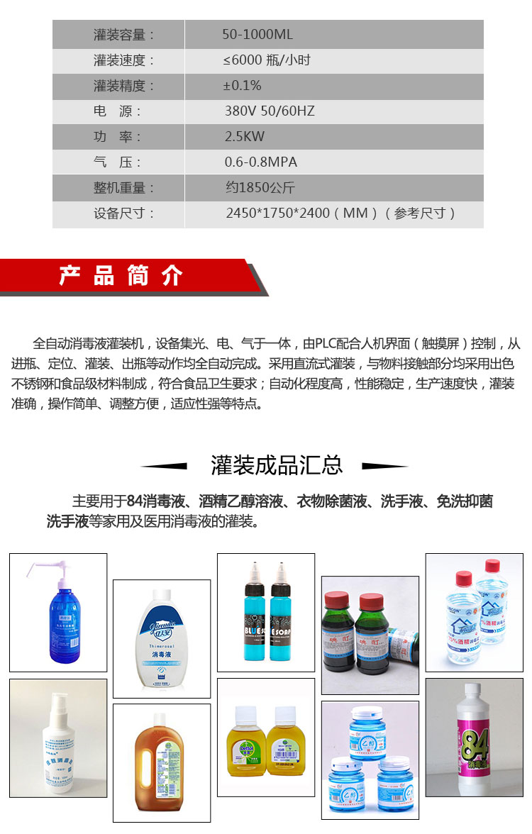 該機(jī)是我司很新研制的消毒液灌裝機(jī),設(shè)備集光、電、氣于一體,由PLC配合人機(jī)界面(觸摸屏)控制,從進(jìn)瓶、定位、灌裝、出瓶等動作均全自動完成。采用直流式灌裝,與物料接觸部分均采用出色不銹鋼和食品級材料制成,符合食品衛(wèi)生要求;自動化程度高,性能穩(wěn)定,生產(chǎn)速度快,灌裝準(zhǔn)確,操作簡單、調(diào)整方便,適應(yīng)性強(qiáng)等特點(diǎn)。
