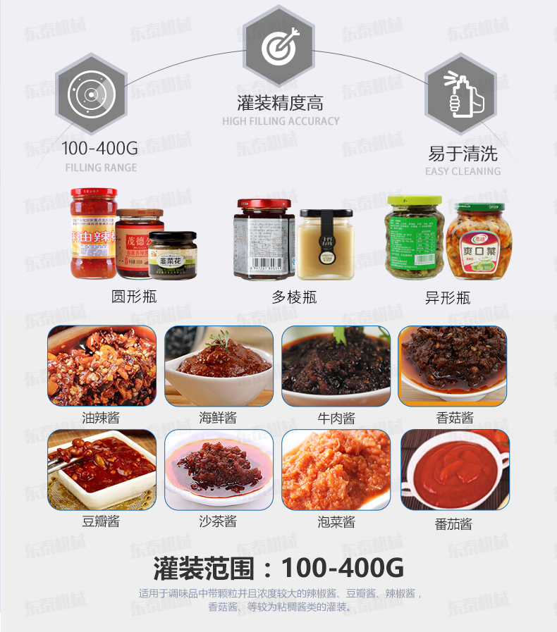顆粒醬灌裝機采用活塞式灌裝原理,適用于調(diào)味品中帶顆粒并且濃度較大的辣椒醬、豆瓣醬、花生醬、香菇醬、果醬、牛油火鍋底料、紅油火鍋底料、蝦醬等較為粘稠醬類的灌裝。